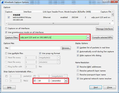 開啟wireshark,設(shè)置捕獲參數(shù)(“Capture Options”),選中“本地連接”,并設(shè)置過濾器和停止時間,并點擊“Start”,如下圖所示: