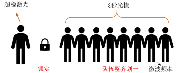 如果把超穩(wěn)光生微波源比作排隊走的隊列,那么超穩(wěn)激光就像隊列里面的帶隊人,隊伍的步伐大小、整齊度、每位隊員的相對位置都由這個領(lǐng)隊決定。飛秒光梳就像隊列里面的隊員,在沒有和超穩(wěn)激光建立聯(lián)系之前,光梳是自由運轉(zhuǎn)的,就如圖 6中所示的一樣混亂。而當(dāng)通過一系列復(fù)雜的操作和領(lǐng)隊建立聯(lián)系后,就能使得每位隊員的步伐大小、步速、以及和其他隊員的相對位置都和領(lǐng)隊高度同步,如同圖 7所示,這樣就產(chǎn)生的超穩(wěn)光生微波信號。